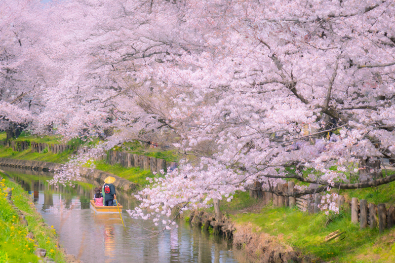 新河岸川に架かる「宮下橋」から氷川神社裏手に位置する「氷川橋」、そして「田谷堰」までの500mほどの桜並木。4月上旬の週末に行われる「小江戸川越春の舟遊」では、和舟に乗ってお花見ができる。