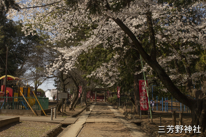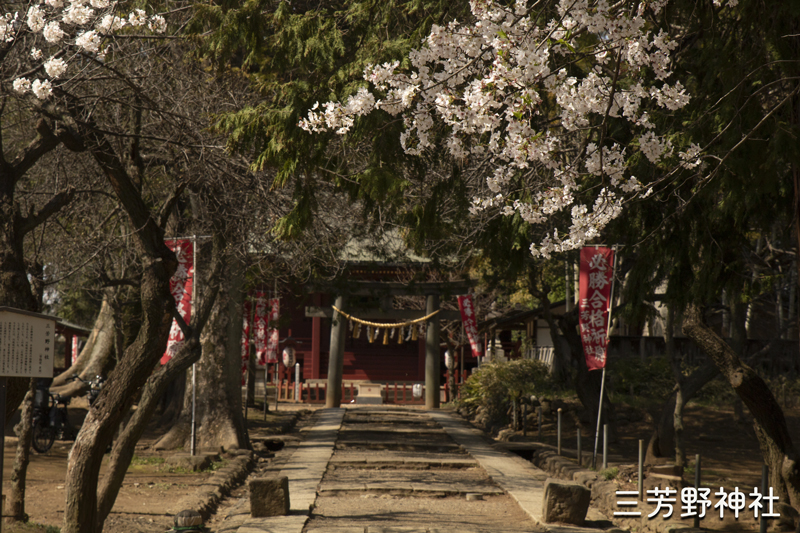 童謡「通りゃんせ」の発祥の地とされる三芳野神社。 鳥居まで続く杉並木の隙間にソメイヨシノの枝が覗かせる、ノスタルジックな春の風景が印象に残る。